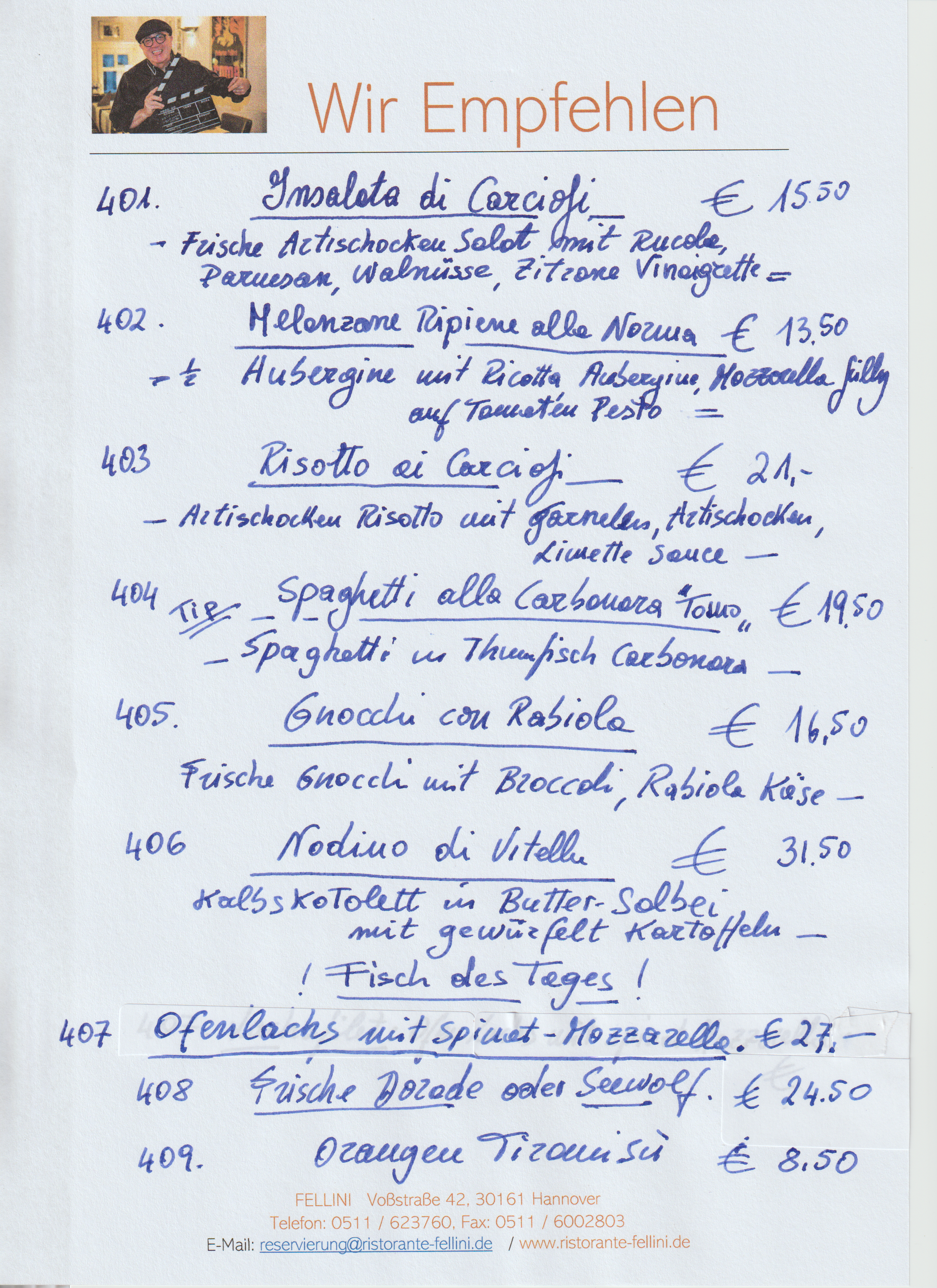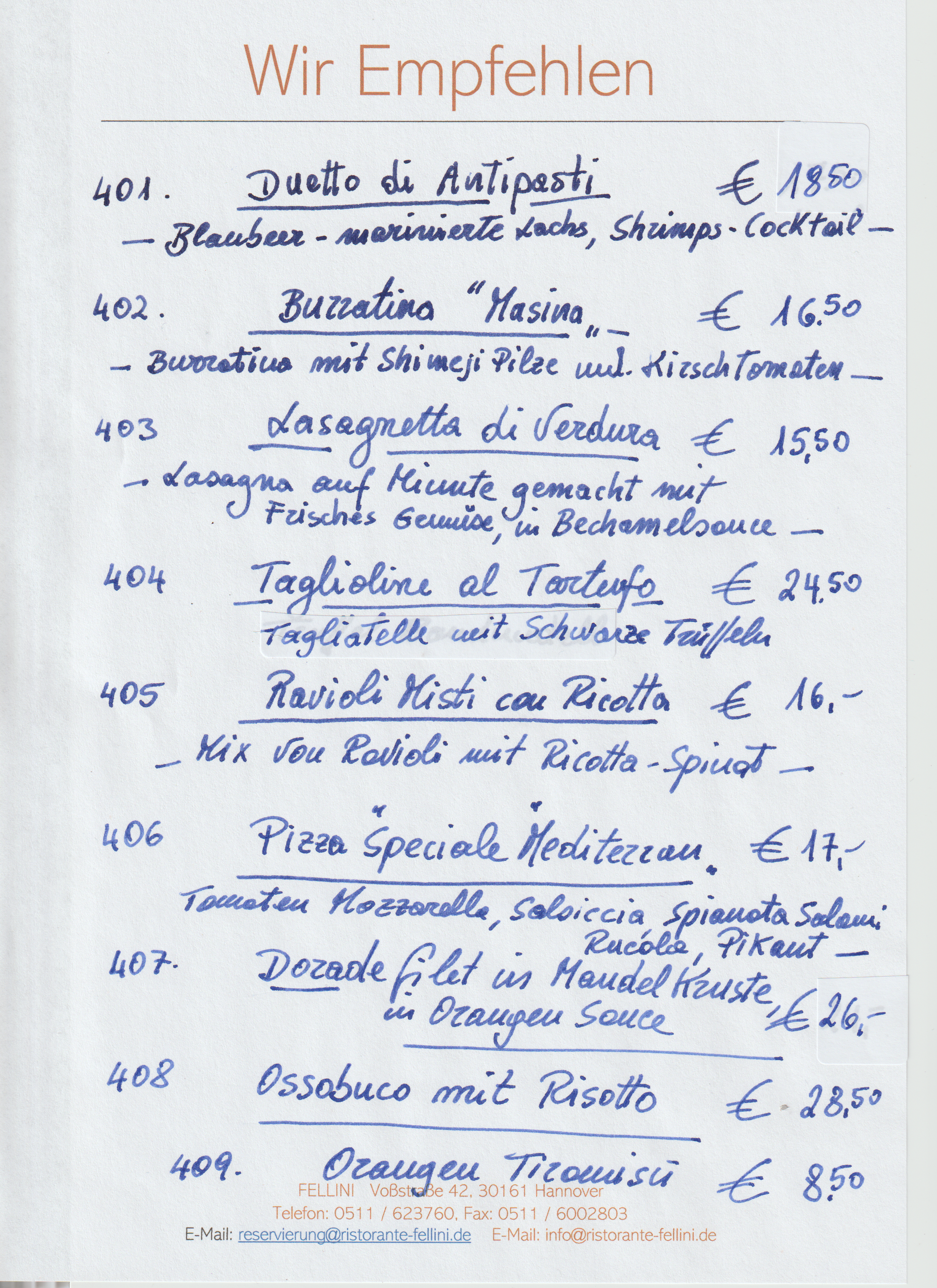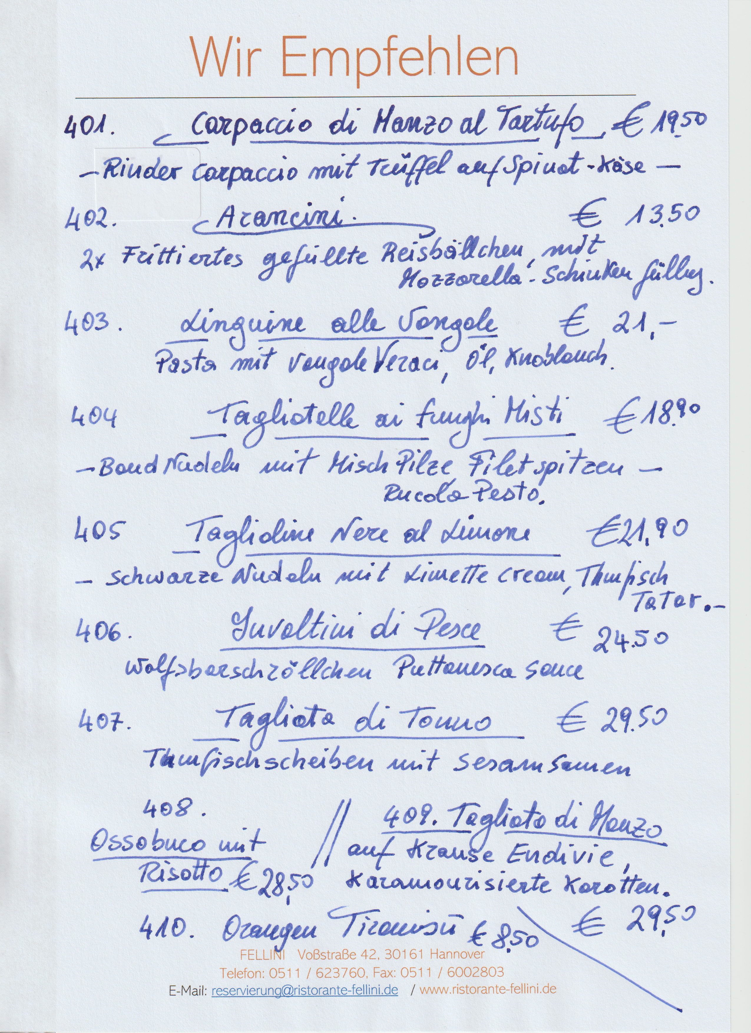 Köstlichkeiten aus der Vielfalt der italienischen Küche. In unsere Töpfe kommen ausschließlich frische Produkte, deren Eigenaromen unterstrichen und nicht durch überflüssige Zutaten dominiert werden.
