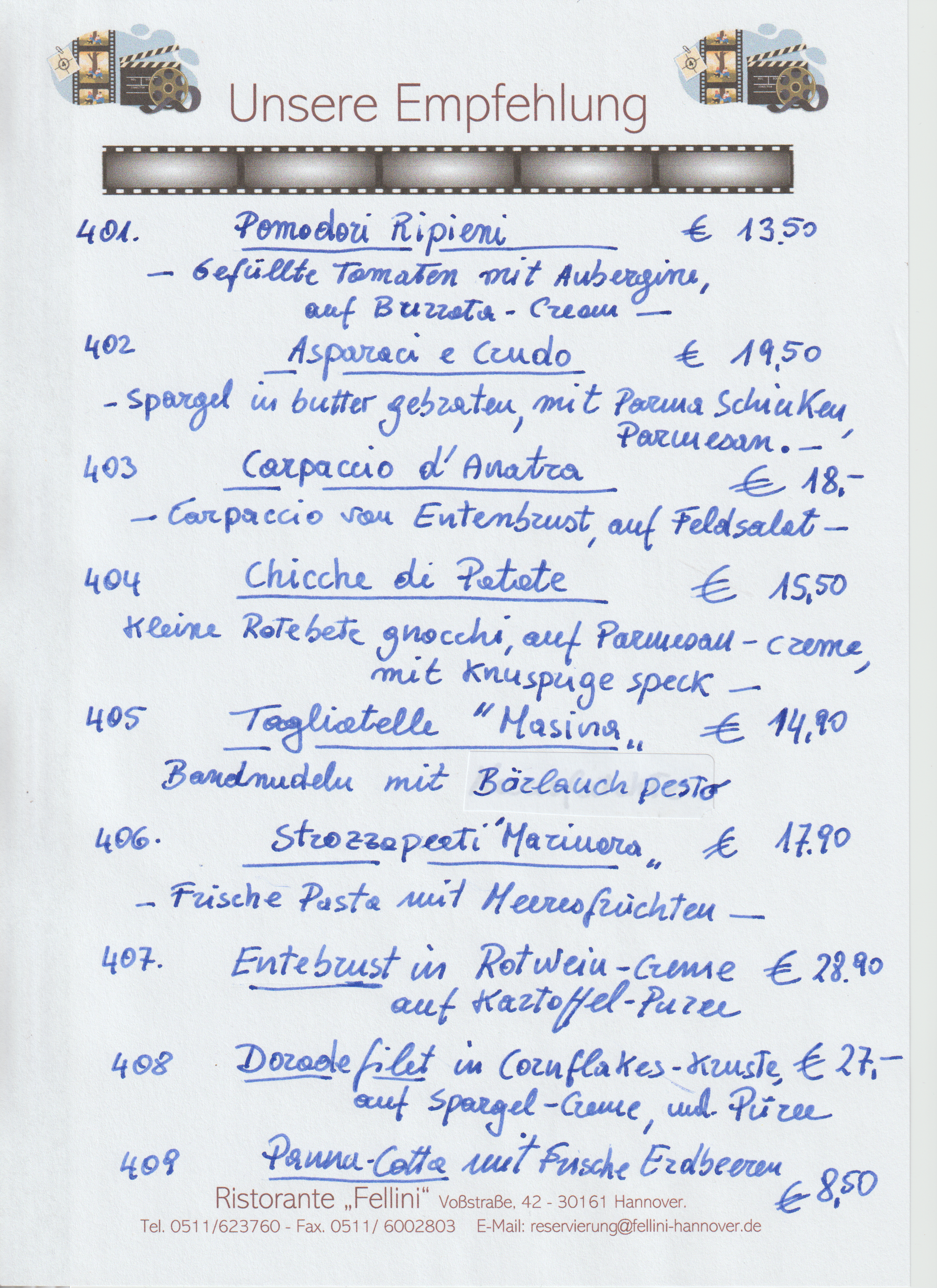 Fellini hat sehr gutes Essen in familiärer Führung. Die Restaurant ist verteilt auf 2 Etagen und sehr verwinkelt. deko orientiert sich am Thema Film und bekommt dadurch ein eigenen Charakter. Musik italienisch. Bedienung nett. Essen typisch italienisch eher gehoben und Preis angemessen. Komme gerne wieder.