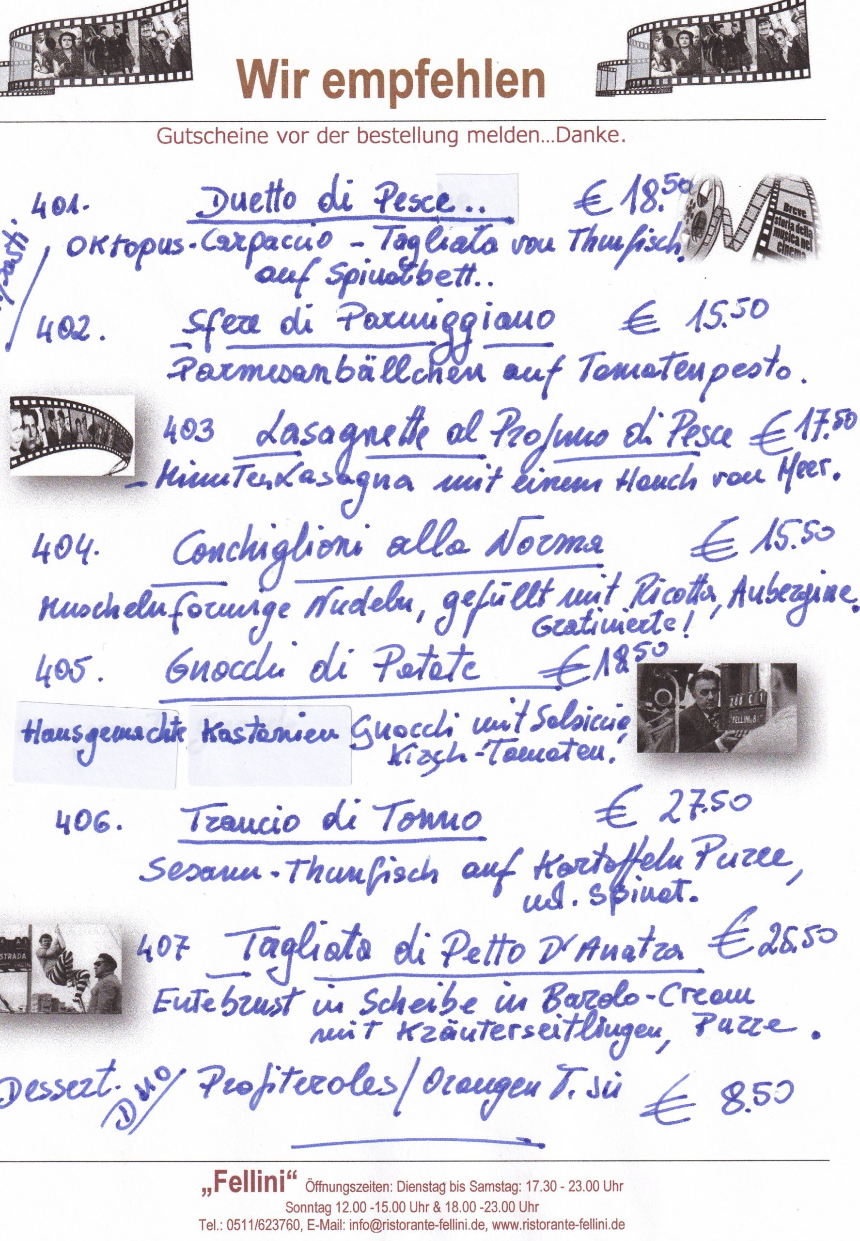Liebe Gäste, wir sind im Urlaub, in der Zeit vom 27.07.2025 bis 15.08.2025 bleibt das Fellini geschlossen. Ab dem 16.08.2025 sind wir wie gewohnt für Sie da. Das Fellini Team wünscht Ihnen eine schöne Urlaubszeit! Ihr Fellini TeamFranco und Monika Scevola P.S.: Im Notfall erreichen Sie uns unter 0172 / 354 75 73.